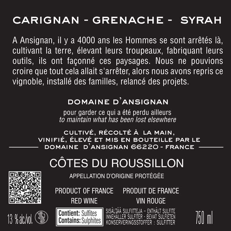 A Ansignan, il y a 4000 ans les Hommes se sont arrêtés là, cultivant la terre, élevant leurs troupeaux, fabriquant leurs outils, ils ont façonné ces paysages. Nous ne pouvions croire que tout cela allait s'arréter, alors nous avons repris ce vignoble, installé des familles, relancé des projets.